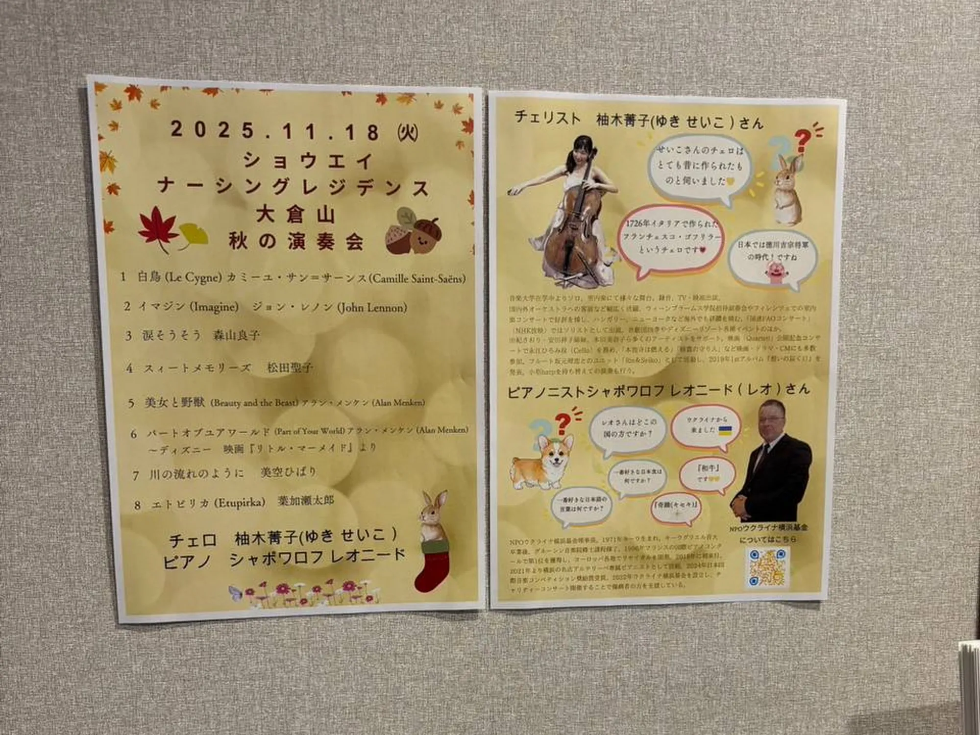 11 листопада 2025 в Шьоуей Нарсінг Резіденс Окураяма відбувся особливий концерт, організований завдяки зусиллям співзасновниці НПО «Україна-Йокогама» Куги Кахоко.